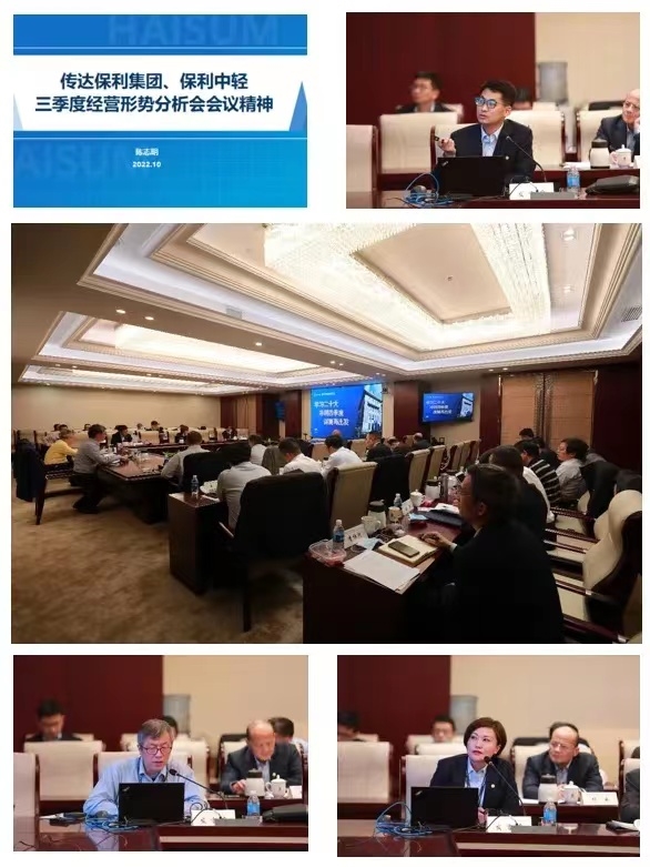 On October 25, China Haisum held the production and operation analysis meeting in the third quarter of 2022 in Shanghai to convey and implement the spirit of the third quarter business situation analysis meeting of the group company, summarize the completion of various tasks in the first three quarters, and study and deploy key tasks in the fourth quarter and next year. Zhao Guo'ang, chief economist of Poly Sinolight, secretary of the CPC Committee and chairman of the Company, attended the meeting and delivered a speech. Chen Rongrong, deputy secretary of the CPC Committee and president of the Company, members of the Company's leading team, heads of all departments of the headquarters and members of the leading team of various business units attended the meeting in the form of live and video respectively. The meeting was presided over by Zhou Yuan, the vice president of the Company.