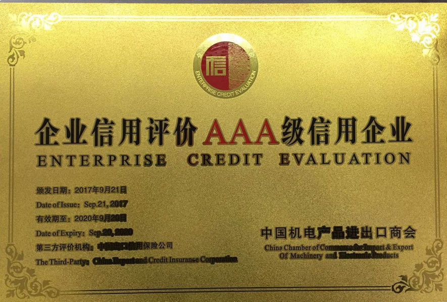 近日,中國機電產品進出口商會公布了2017年機電行業信用評價企業名錄,我司再次榮獲“成套工程(chéng)領(lǐng)域AAA級(最高級別)信用企業稱號”。