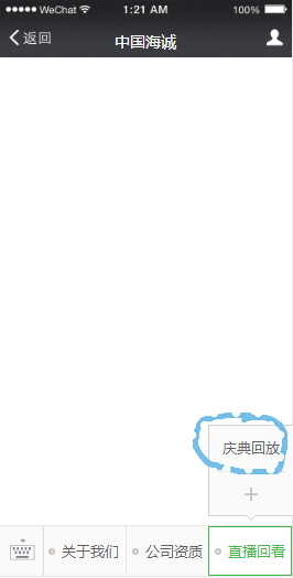 2、點擊自定義菜單(dān)“直播回看”—“慶典回放”按鈕進入直播頁麵。