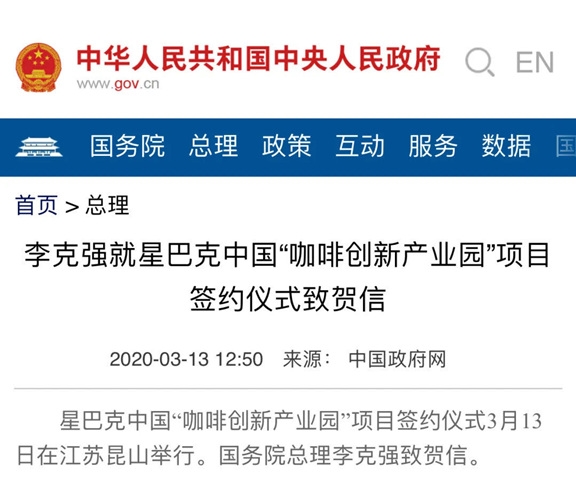 2020年3月13日,星巴克中國“咖啡創新產業園”項目簽約儀式在江蘇昆山舉行。國務院總理李克強致賀信。