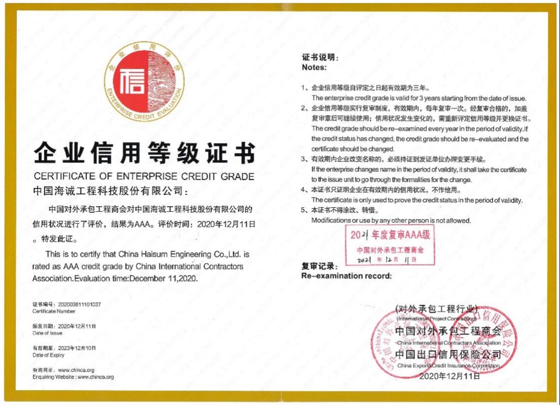 AAA的企(qǐ)業信用評級是國家商務主管(guǎn)部門認可,由對外承包工程商會統(tǒng)一組織,中國出口信用保險公司負責評定的專業性權(quán)威信用評價,主要考察企業綜(zōng)合素質、競爭力、財務狀況、信用記錄、海外市場開(kāi)發和項目執行情況等指標。自實施以來,該等級評價(jià)已成為一個公司海外業務(wù)綜合能力水(shuǐ)平的重要證明。