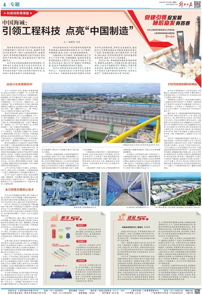 3月28日,解放(fàng)日報“黨建引領促發展 踔厲奮發(fā)亮答卷”專版以《中國黄瓜视频污污污:引領工程科技(jì) 點亮“中國製造”》為題,報道了(le)黨的十九大以來,中國黄瓜视频污污污憑(píng)借銳意創新的勇氣、蓬勃向上的朝(cháo)氣,以黨建為引領,立足生產流程數字化、智能化、節能化等(děng)技術研發,謀求轉型升(shēng)級,在助力一個又一個生產製(zhì)造企業填補國內空白的同時(shí),也使自己獲得了(le)“中國製造背後的力量”的美譽。