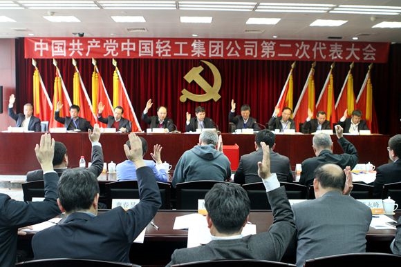 代表們舉手(shǒu)表決通過大會《中國共產黨中國輕工集團公司第二次代表大會選舉辦法》