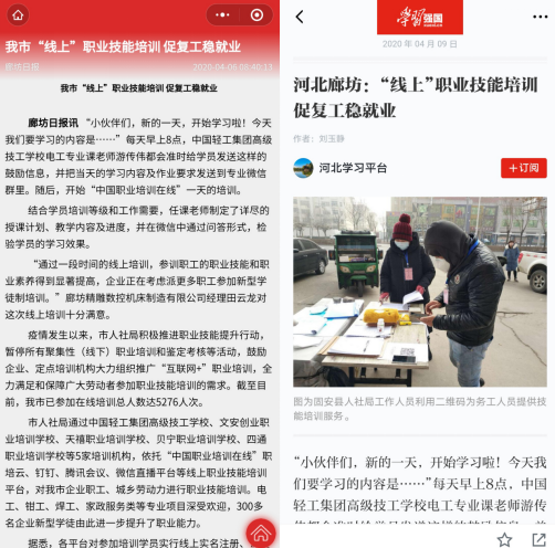 △“學習強國”河北(běi)學習平台和《廊坊日報》分別對中國輕(qīng)工(gōng)集團高級技工學校 “開展企業新型學徒製線上教學,助力複工複產、穩就業”的情況進行了相關報道