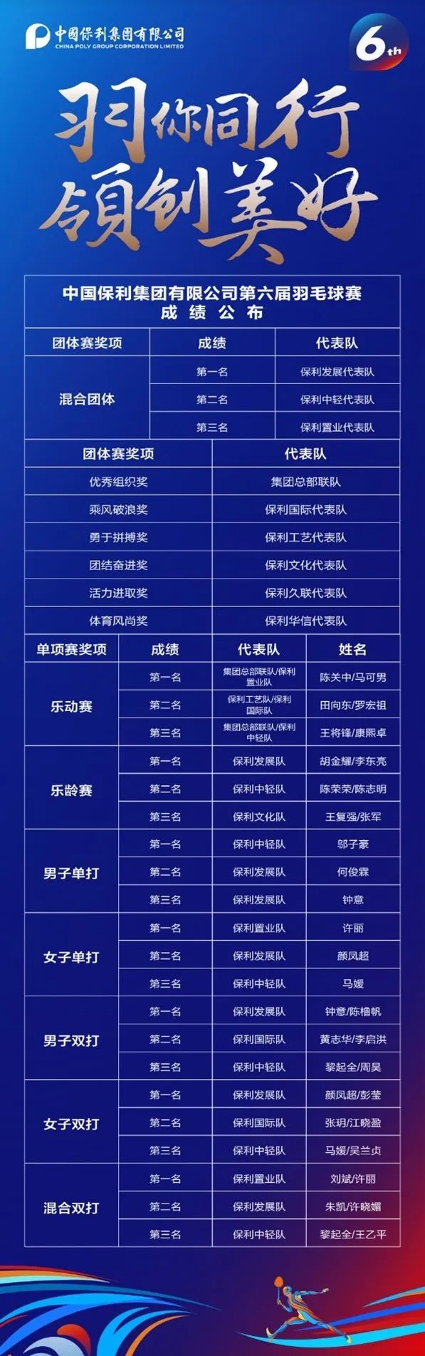 保(bǎo)利中輕代(dài)表隊由保利中(zhōng)輕副總經理、總會計師段趙清帶隊,由選拔自子公司的(de)12名(míng)運動(dòng)員組成。本次比賽中,保利中輕羽球健兒奮勇拚搏、超越自我(wǒ),斬獲了優良戰績。