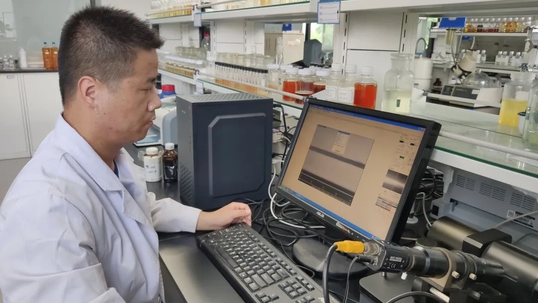 “界麵張力開始能到超低(dī)(<0.01mN/m) ,但是油珠回縮快,需要加(jiā)入親水性組分調節”“3g/L濃度,5分鍾可到超低,測試一下低濃度時的界麵張力”“濃度1g/L,15分鍾可到超低,繼續降低濃度(dù)測試,找出適用的濃度範圍”……這(zhè)是保利中輕(qīng)所屬(shǔ)中國日用化學研究院磺(huáng)化研究室團(tuán)隊成(chéng)員正在為位於渤海灣北部沿海地區的某油田進行開發超低界麵張力表(biǎo)麵活性劑的實(shí)驗場景(jǐng)。