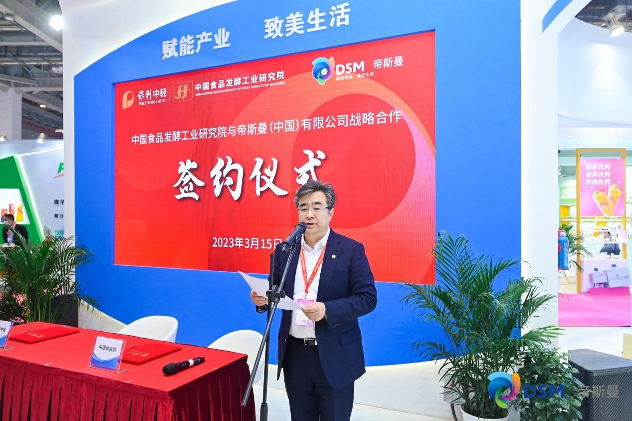 展會期間,中國食品發酵工業研究院與帝斯(sī)曼(中國)有(yǒu)限(xiàn)公司舉(jǔ)行“營養健康原料標準化聯合研究中心”戰略合作簽約儀式。安勝傑表示,雙方將發揮帝斯曼集團在健康、營養(yǎng)和生物科學領域等方(fāng)麵的核心(xīn)技(jì)術優勢,以及中國食品發酵工業(yè)研究院在食品發酵行業(yè)質量安全保障、成果(guǒ)產業化、產(chǎn)品(pǐn)研發資(zī)源(yuán)等方麵的行業積澱,實現創新發(fā)展、互惠互利,共同(tóng)推動(dòng)食品產業標準化水平和質量安全的全麵(miàn)提升。