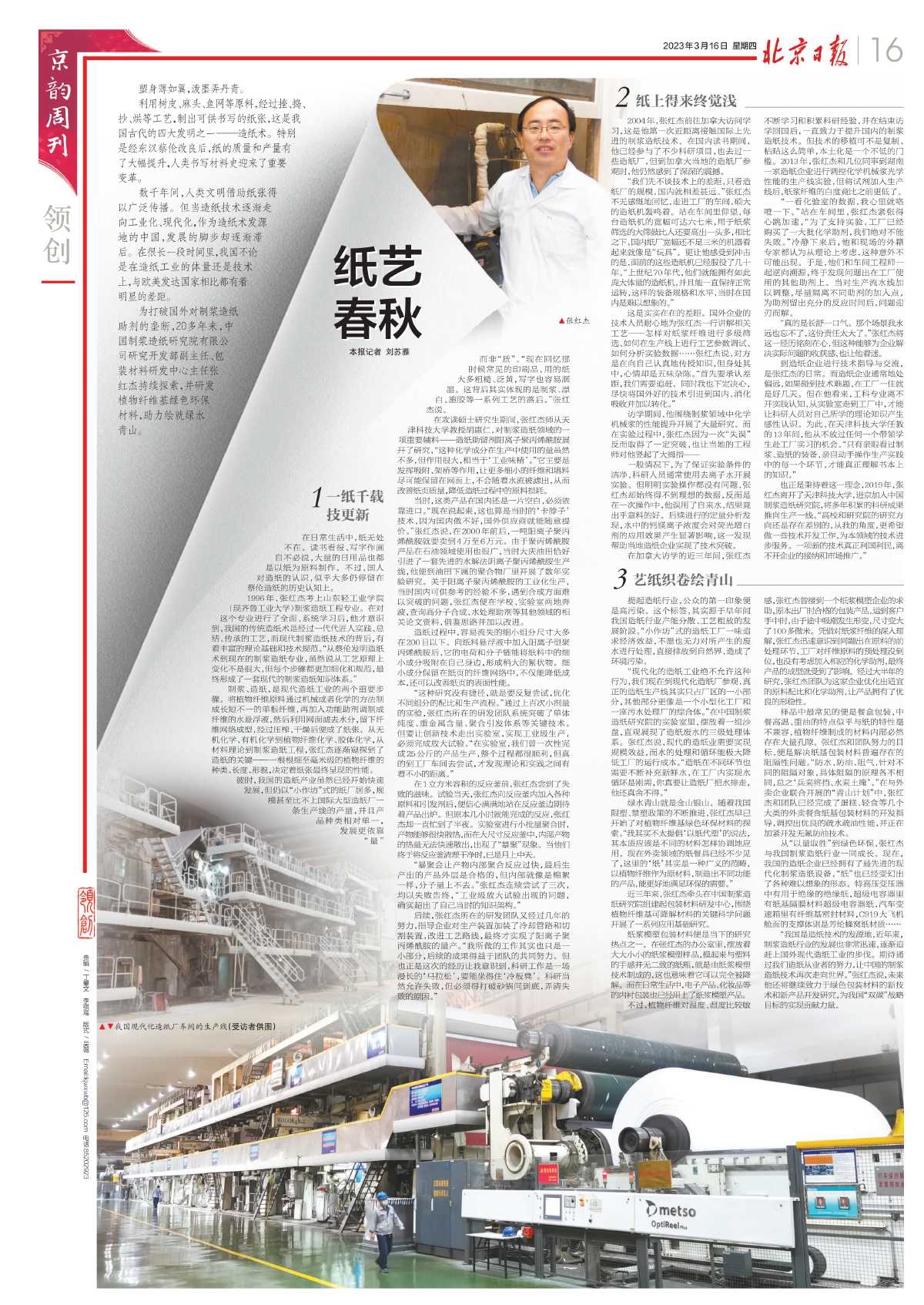 2023年3月16日,《北京日報》“京韻周刊·領創”專(zhuān)欄以《紙藝春秋》為題,刊發保利中輕(qīng)所屬中國製漿造紙研究院研究開發部副主任、包裝研發中心主任張紅傑及其團隊,為打破國外對製漿造紙助劑的壟斷,持續研發植物纖(xiān)維基綠色環保材料,助(zhù)力繪(huì)就綠水青山的故事。與大家分享——