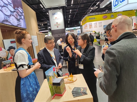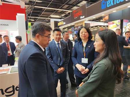 展台首日即吸(xī)引了來自歐亞等產業鏈上下遊參展企業和觀眾的持續關注。保利集團總經理助理,保利中輕(qīng)黨委書記、董事(shì)長安勝傑來到中國食品發酵工業(yè)研(yán)究院展台,親切慰問參展員工,並前往(wǎng)安琪酵母(mǔ)、加拿大Saputo乳業公司、法國SILL SAS集團、荷(hé)蘭Salud Foodgroup Europe BV等相關展台進行交流(liú),與世界食品博覽會(Anuga)主辦方就未來有關合作進行交流,並接(jiē)受主辦方專(zhuān)題采訪。