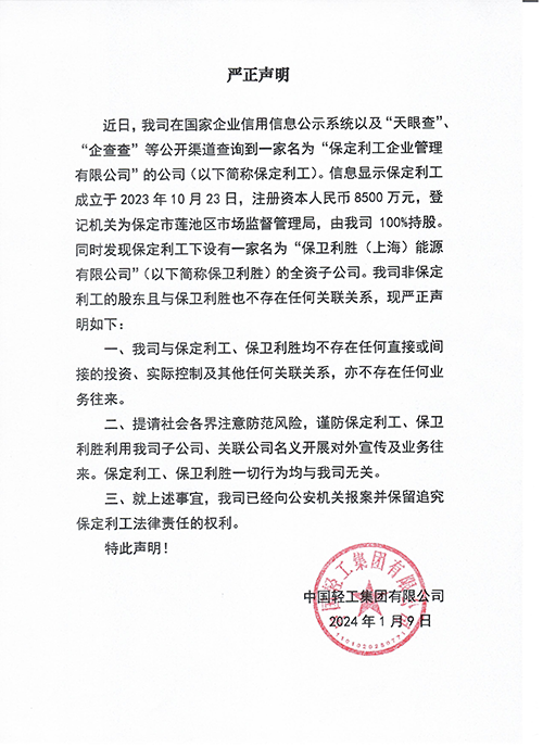 近日(rì),我(wǒ)司在國家(jiā)企業信用信(xìn)息公示係統以及“天眼查”、“企查查”等(děng)公開渠道查詢到一家(jiā)名為“保定利工企(qǐ)業管(guǎn)理有限公司”的公司(以下簡稱保定利工)。信(xìn)息顯示保定利工成立於2023年10月23日,注冊資本人民幣8500萬元(yuán),登記機關為保(bǎo)定市蓮池區市場監督管理局,由我司100%持股。同時發現保定利工下設有(yǒu)一家(jiā)名為“保(bǎo)衛利勝(上海)能源有限公司”(以(yǐ)下簡稱保衛利勝)的全資子公司。我司非保(bǎo)定利工的股東(dōng)且與保衛利勝也不存在任何關聯(lián)關係,現(xiàn)嚴(yán)正聲明如下: