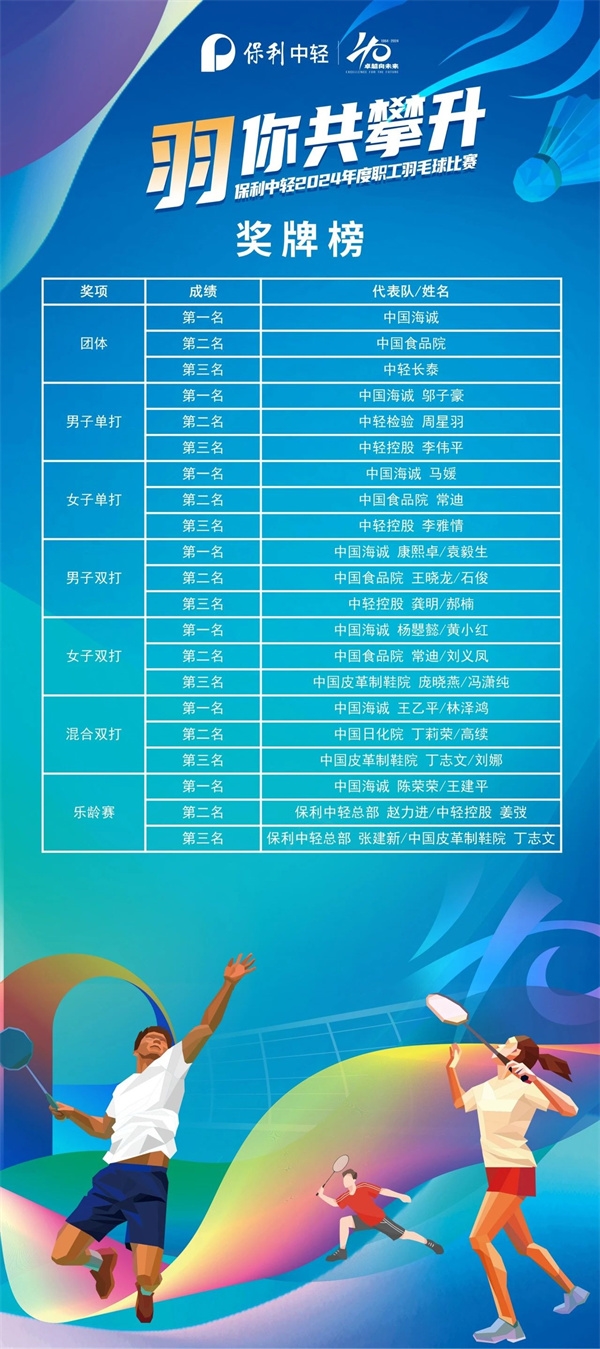 “羽”你共攀升!各代表隊運動員團(tuán)結拚搏、勇(yǒng)於進(jìn)取,充分體現了保利中輕(qīng)人勇攀(pān)高峰的一貫追求,盡情展示了保利中輕人(rén)團結奮(fèn)鬥的精神品質。大家紛(fēn)紛(fēn)表示,將以飽滿的激情、昂揚的鬥誌、勇於拚搏的信念、向上團結的精神,迎接時代的挑戰,擔當時代的使命,用實際行動落實黨(dǎng)的二十屆三中全會(huì)精(jīng)神,推動保(bǎo)利中輕實現高質量發展新攀升!