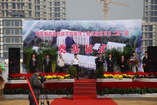 20121012,俞海星總(zǒng)經理出席了中國(guó)製漿造紙研究院廊坊工程實驗室項目二期工程開工奠基儀式。俞總在致辭中對(duì)造紙院廊坊(fāng)項目建設工作給予了充分肯定,對長期以來關心和(hé)支持中輕(qīng)集團發展,特別是關(guān)心(xīn)和支(zhī)持該項(xiàng)目籌備實施的廊坊(fāng)市(shì)各級領導和部門表示了感謝,並向為工程開工付出辛勤勞動的一線幹部(bù)職工表示(shì)了(le)慰問。他希望項(xiàng)目承建單位(wèi)要切實增(zēng)強緊迫感和責任感,嚴格工程管理,確保安全、質量和進度,力爭把(bǎ)項(xiàng)目建(jiàn)設成為廊坊科技穀(gǔ)的標誌性、樣板性工程。中國製漿造紙研究(jiū)院院長曹春昱(yù)和廊坊(fāng)科技(jì)穀有關領導也分別(bié)在儀式上致(zhì)辭。