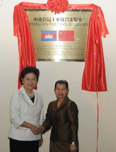 2012年12月7日,國務委員劉(liú)延東與柬埔寨王(wáng)國(guó)副(fù)首相梅森(sēn)安在柬(jiǎn)埔寨首都(dōu)金邊共同為“中(zhōng)柬食(shí)品(pǐn)工業聯合實驗室”揭牌。教育部部長袁貴仁、科技部黨組書(shū)記王誌剛、國務院副秘書長江小涓、外交部(bù)副部長(zhǎng)宋濤及柬埔寨國務委員會、工(gōng)業礦產及(jí)能源部、教育部、外交部等部門高級官員出席揭牌儀式。集團公司陳鄂生(shēng)董(dǒng)事長出席儀式並(bìng)陪同兩國領導人參觀了實驗室。集團公司所屬中國食品(pǐn)發酵工業研究院院長蔡木易、中(zhōng)國黄瓜视频污污污股份(fèn)南寧公司董事長王毅軍等中柬雙方項目執行人員參(cān)加了典禮。