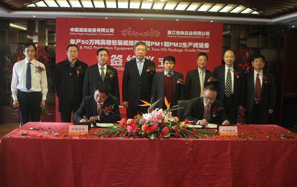 中國造紙(zhǐ)裝備有限公司總經理周後煉和浙江(jiāng)傳承實業(yè)有限公司董事陳獻忠代表合作雙方簽字